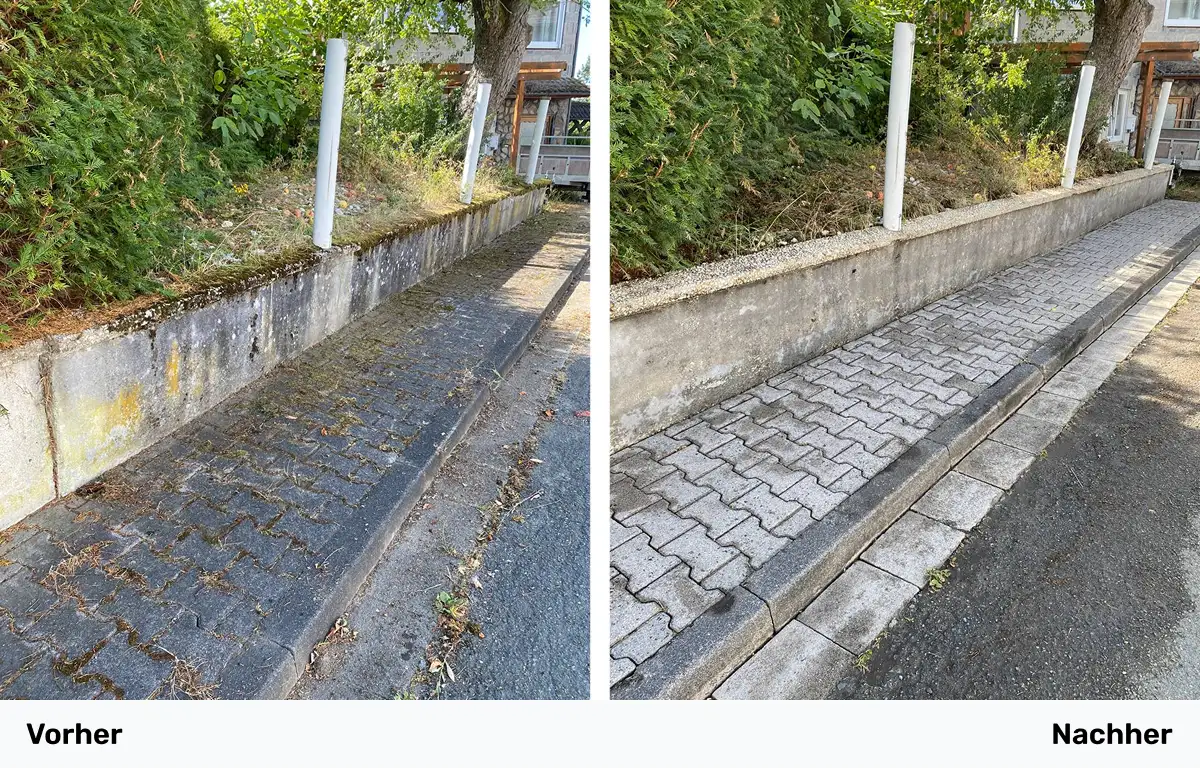 Wir zeigen nicht nur saubere Arbeit, wir dokumentieren sie auch: In unserer Galerie sehen Sie echte Vorher-Nachher-Bilder unserer Einsätze. Jeder Hof, jede Terrasse und jede Einfahrt wird durch unsere professionelle Reinigung sichtbar aufgewertet. Ob vergrünte Steinplatten, verwitterte Fassaden oder vermooste Wege – nach unserem Einsatz sehen Ihre Flächen oft aus wie neu. Und das für eine lange Zeit.