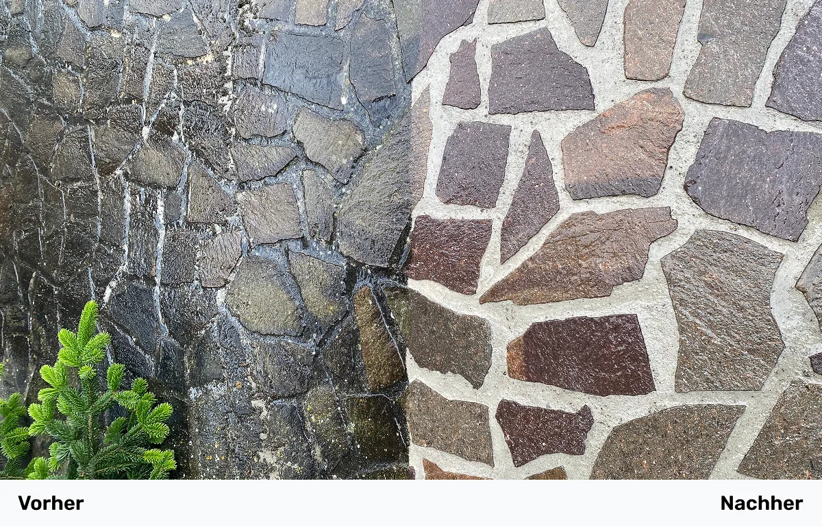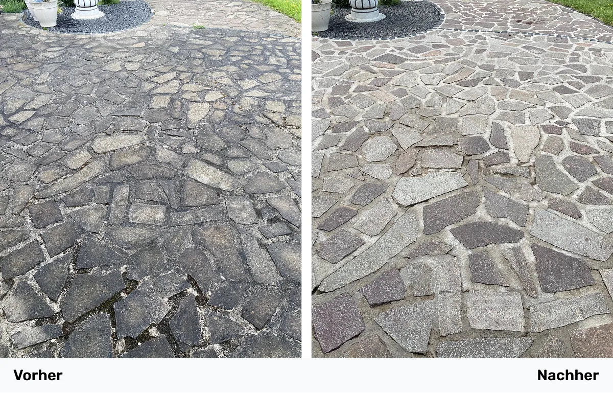 Ob Hof oder Gartenweg: Wir befreien Ihre Steine von Schmutz, Moos und Ablagerungen – das Ergebnis wirkt wie frisch verlegt.